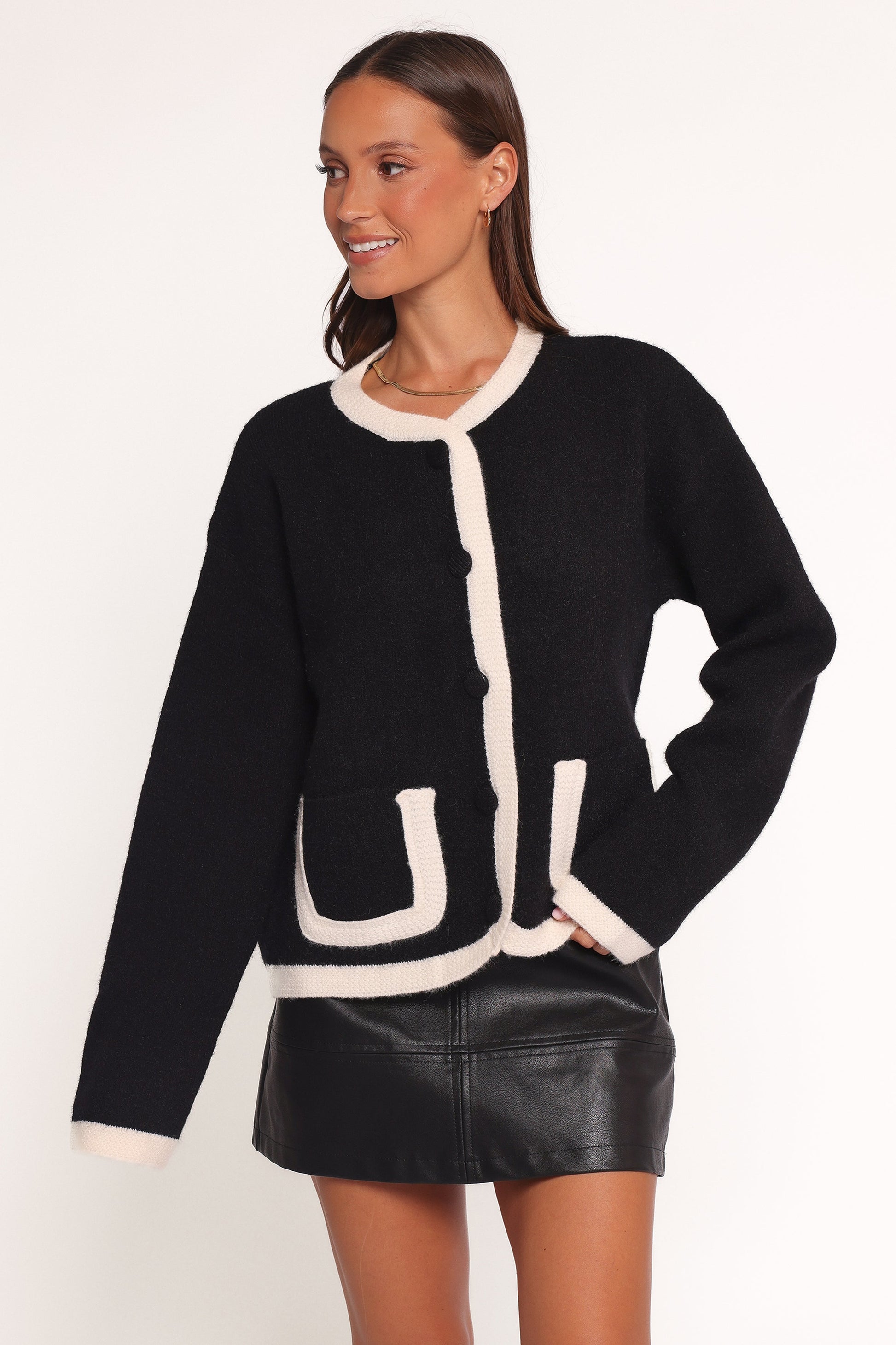 Add a touch of timeless elegance to your wardrobe with the Orabelle Contrast Hem Cardigan in Black. Featuring a chic round neckline and long sleeves, this cardigan is both a cozy and versatile layering piece, perfect for any season.
